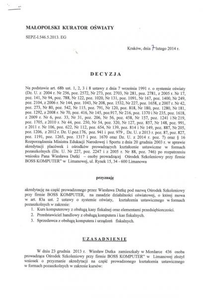 Certyfikat akredytacji Małopolskiego Kuratora Oświaty